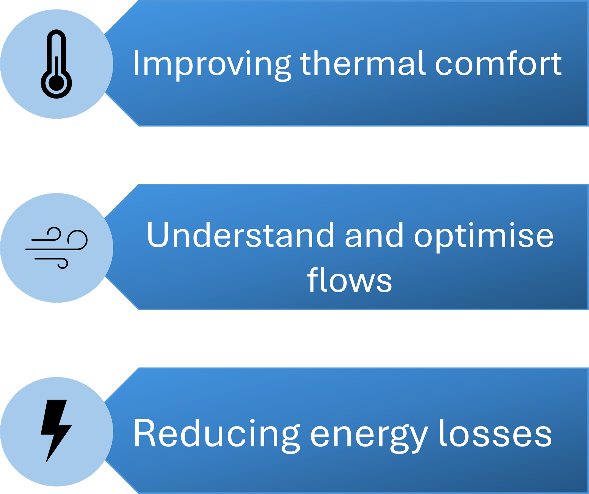 Analysis of air flows and heat exchange in buildings to optimise energy performance, comfort and reliability of installations.